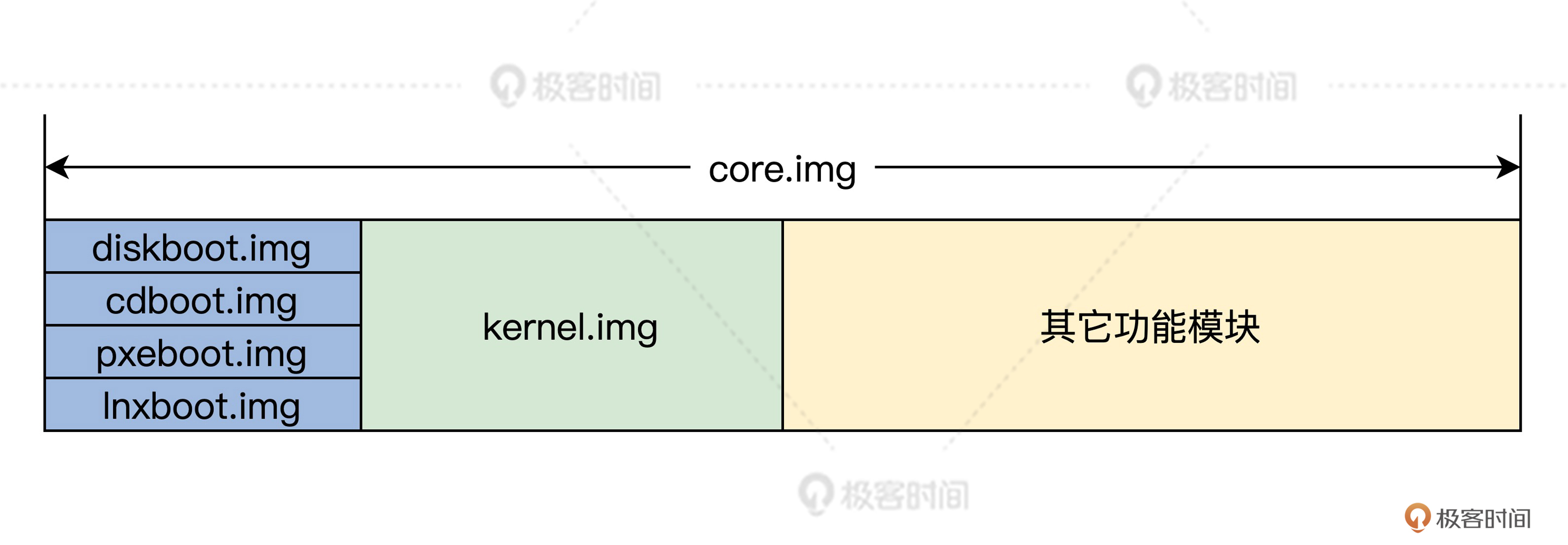 而core.img文件是由GRUB安装程序根据安装时环境信息,用其它GRUB的模块文件动态生成。如下图所示: