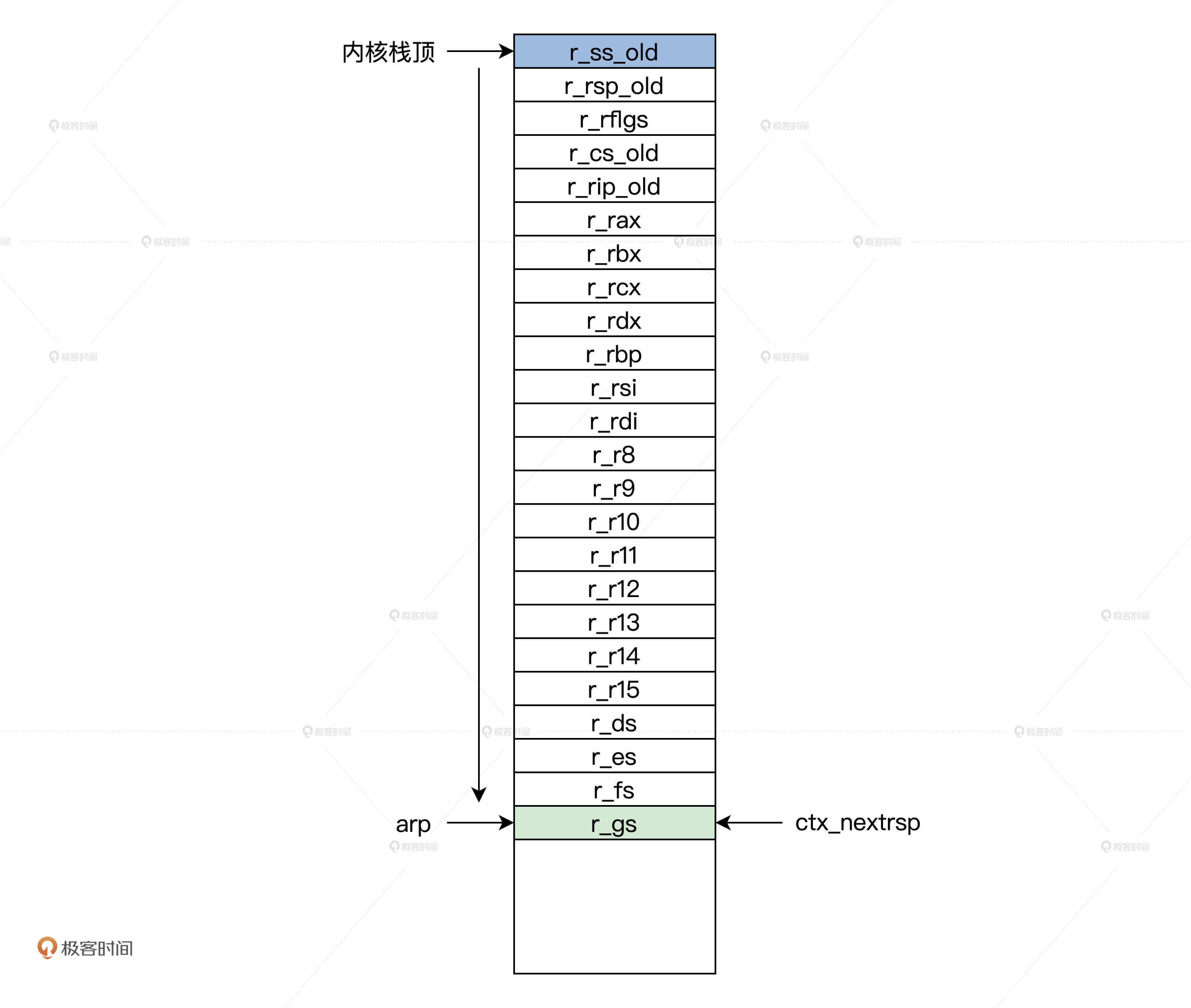 intstkregs_t结构中,每个字段都是8字节64位的,因为x86 CPU在长模式下rsp栈指针寄存器始终8字节对齐。栈是向下伸长的(从高地址向低地址)所以这个结构是反向定义(相对于栈)如果你不理解这个寄存器位置,可以回到中断处理那节课复习一下。
