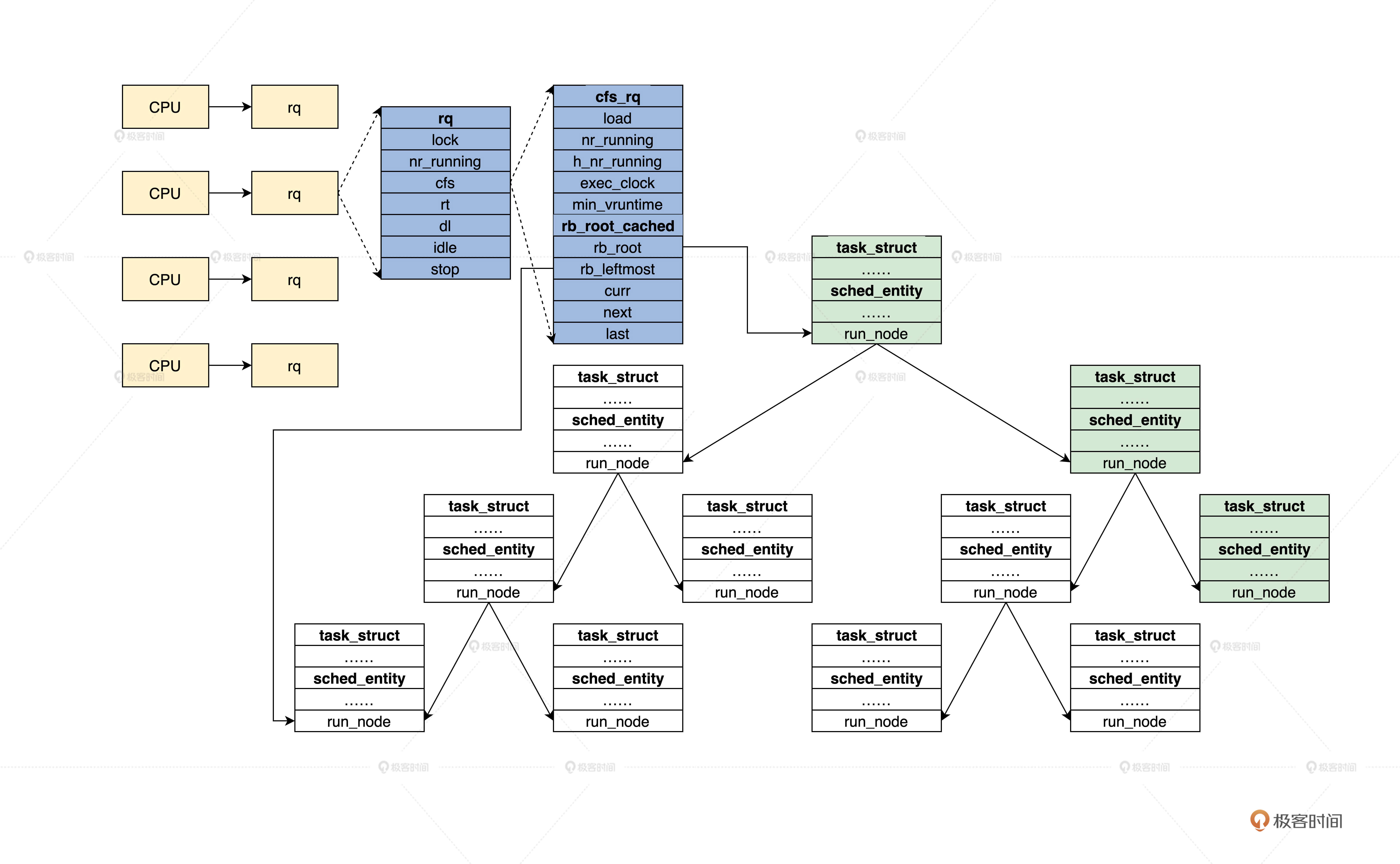 你可能在想。为什么要用红黑树来组织调度实体?这是因为要维护虚拟时间的顺序,又要从中频繁的删除和插入调度实体,这种情况下红黑树这种结构无疑是非常好,如果你有更好的选择,可以向Linux社区提交补丁。