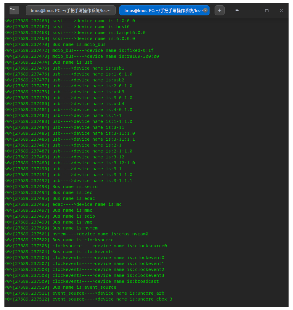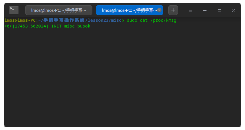 你可以这样操作:切换到本课程的代码目录make一下,然后加载miscdrv.ko模块,最后在终端中执行sudo ./app,就能在另一个已经执行了sudo cat /proc/kmsg的终端中,看到后面图片这样形式的数据。