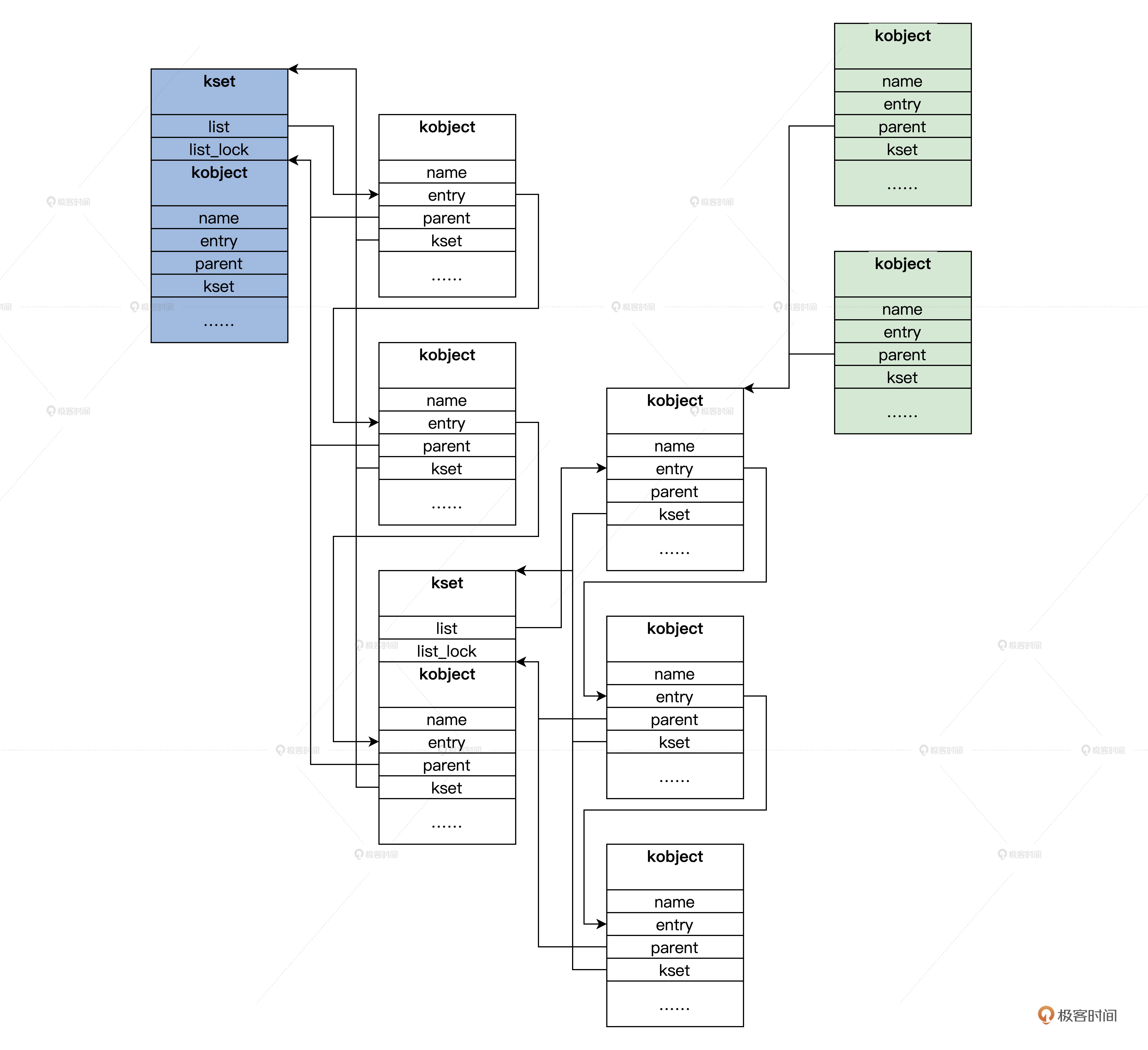 我知道,你可能很难想象许多个kset和kobject在逻辑上形成的层次结构,所以我为你画了一幅图,你可以结合这张示意图理解这个结构。