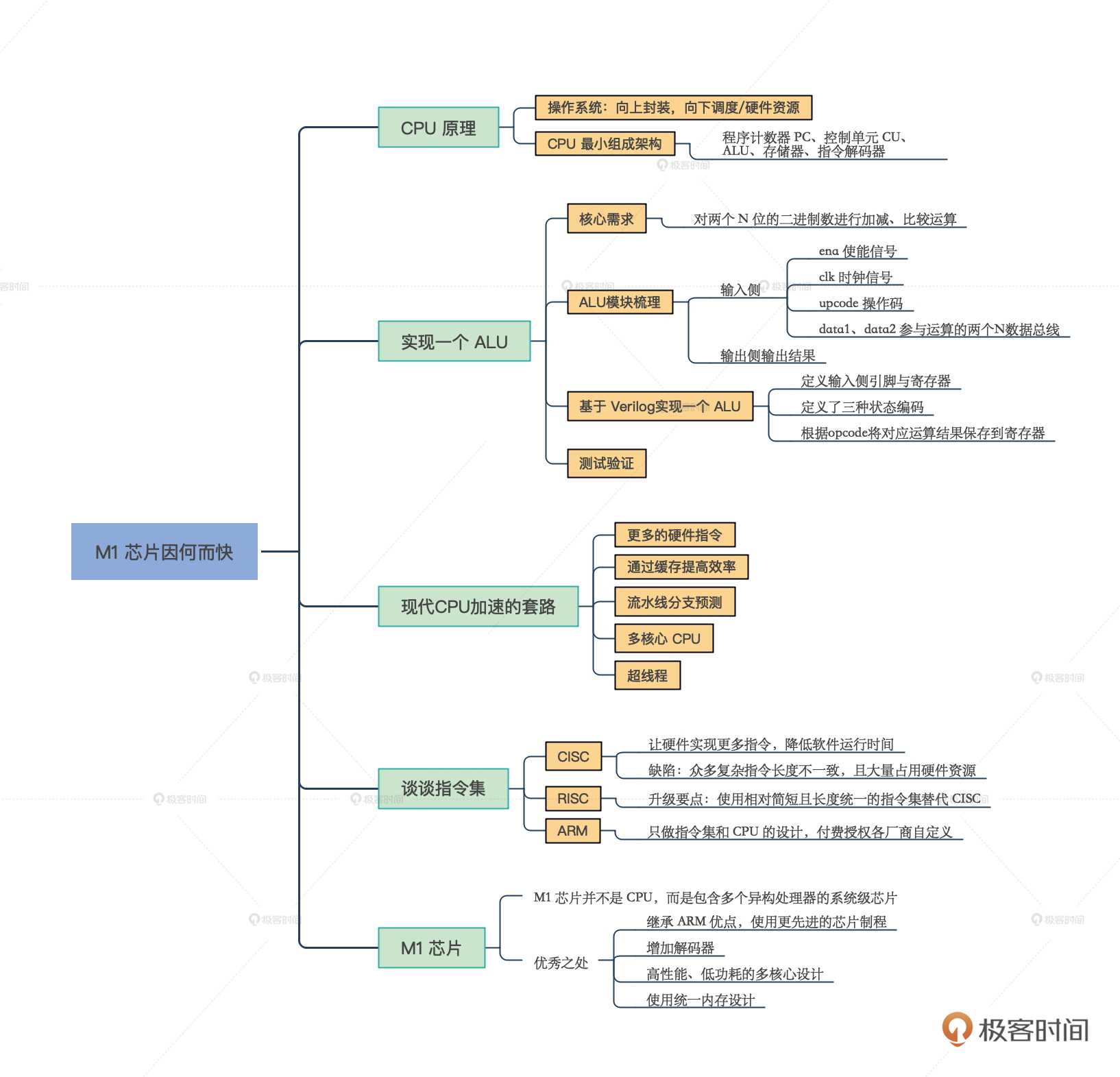 接着,为了把原理落地,我们一起实现了一个ALU,带你加深了对CPU原理的理解。之后我们还了解了现代CPU的发展历程以及设计思路,并分析了CISC、RISC指令的区别,以及基于ARM指令集的M1芯片的特点。