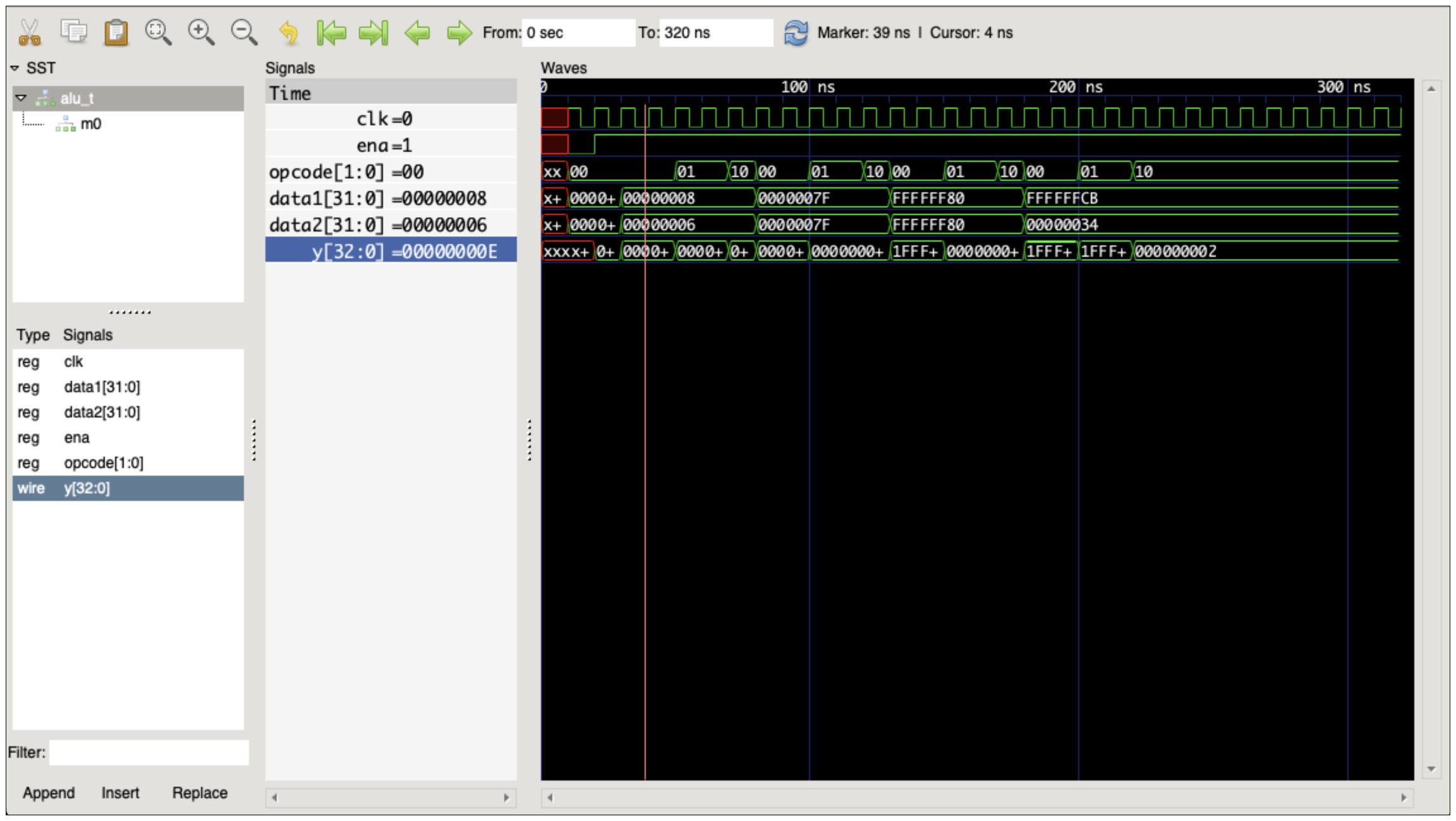 接下来,我们再把生成好的波形文件aly_t.vcd拖入gtkwave中,就能看到ALU模块仿真出的波形图了。