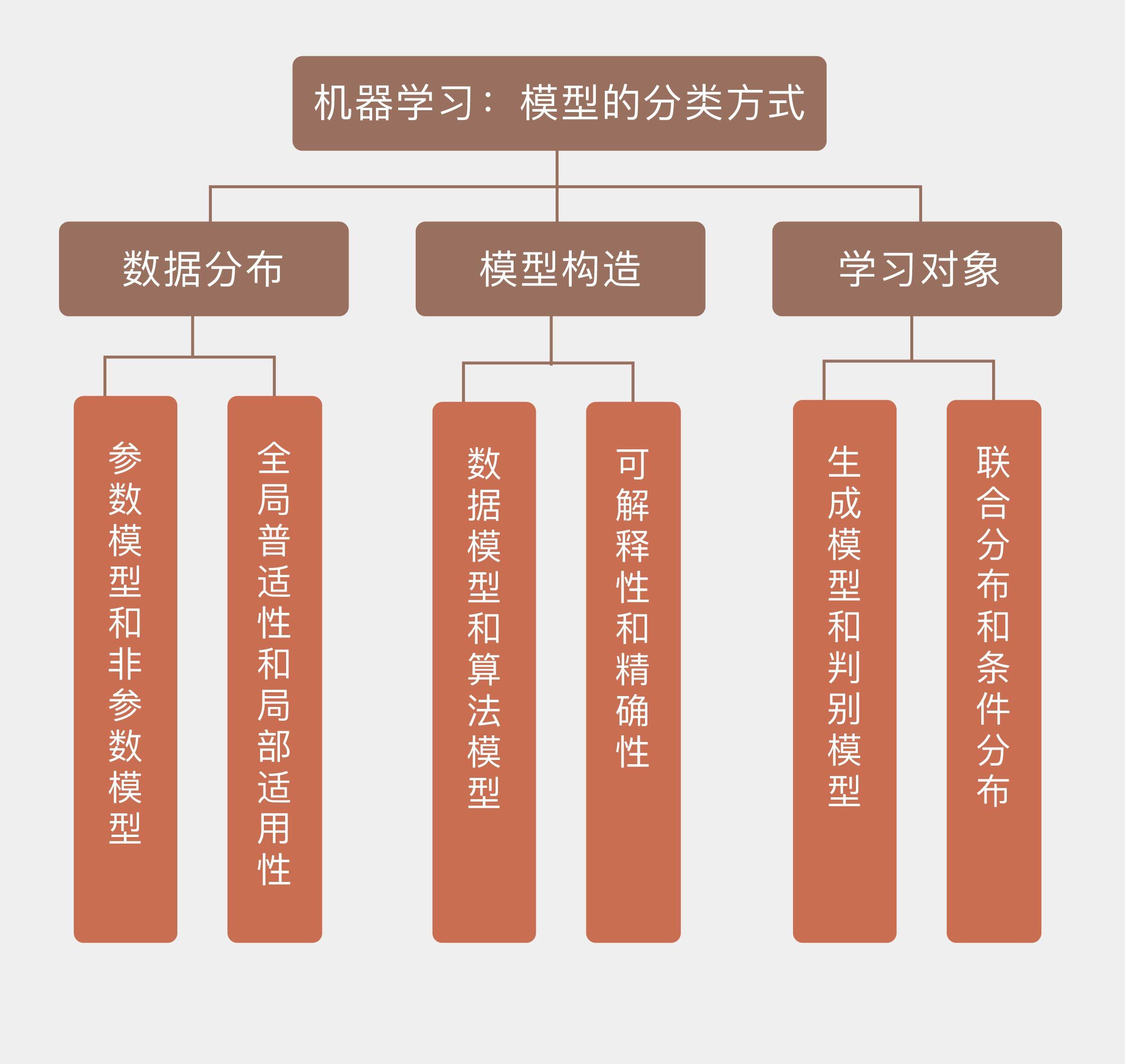 从数据分布的角度看,不同的模型可以划分为参数模型和非参数模型两类。如果将这个划分标准套用到模型构造上的话,得到的结果就是数据模型(data model)和算法模型(algorithm model)。相比于参数对数据分布的刻画,这种分类方式更加侧重于模型对数据的拟合能力和预测能力。