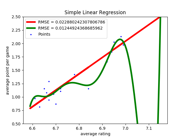 除了难以解释之外,多项式回归还有较高的过拟合风险。还是以前文中的英超数据集为例,线性回归假设场均积分和平均评分之间存在\(y = ax + b\)的关系。从拟合结果来看,虽然存在异常点和误差,这种关系却把握住了自变量和因变量之间的主要趋势。