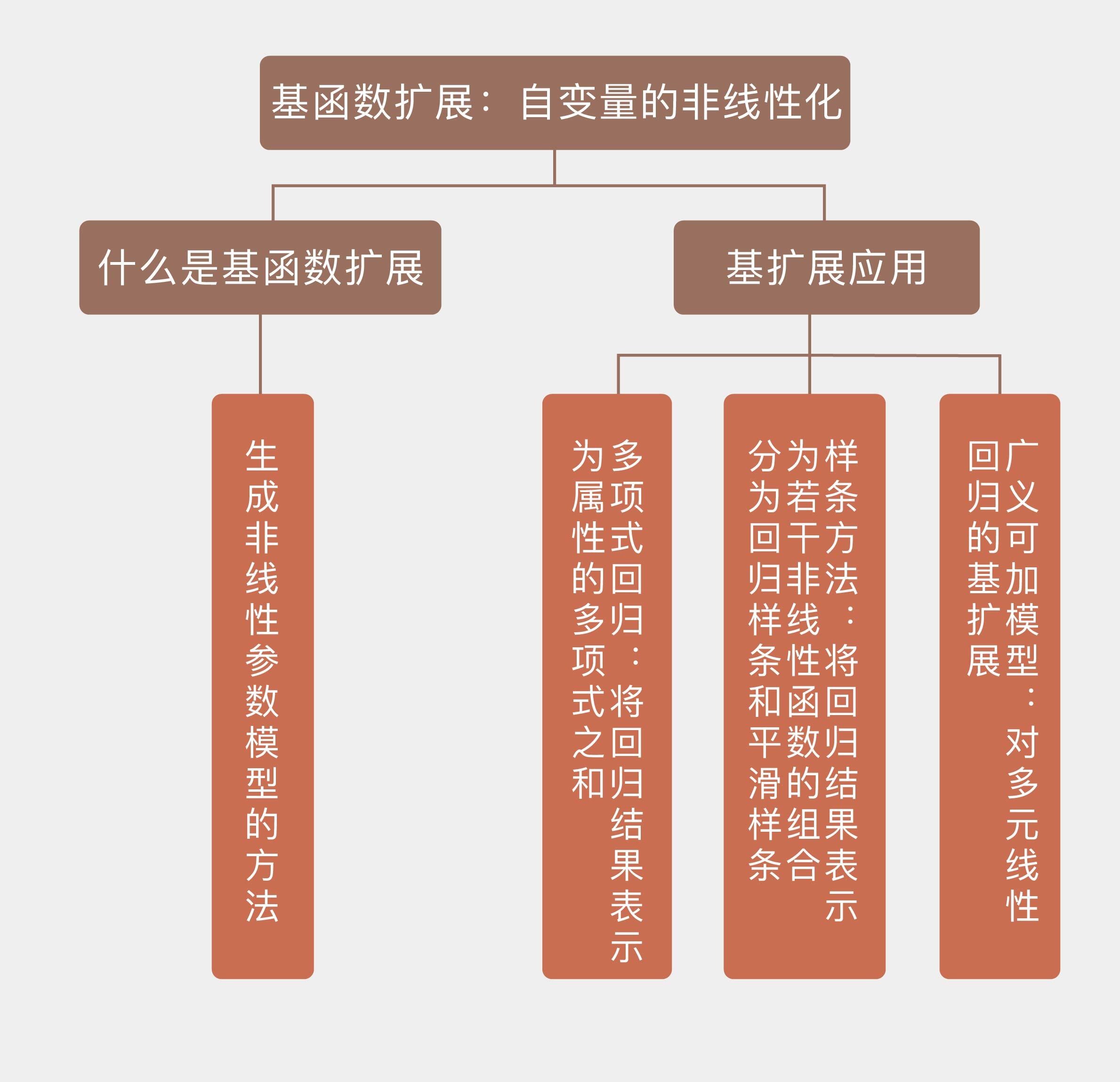 • 基扩展将线性回归中的自变量替换为非线性的函数,使模型能够描述非线性关系;
