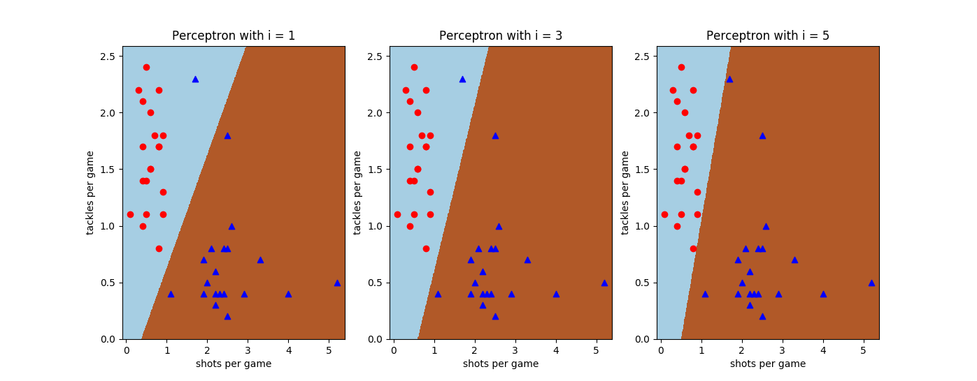 下图给出了感知器对数据集的分类结果,从左到右的迭代次数分别为1,3和5。可以看出,当初始分类结果有误时,感知器的算法会不断将分类边界向误分类点的方向调整,直到分类正确为止。