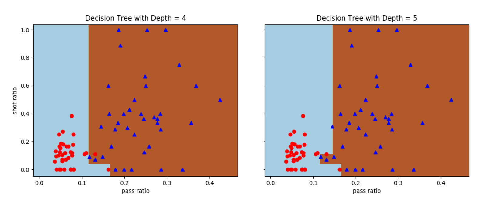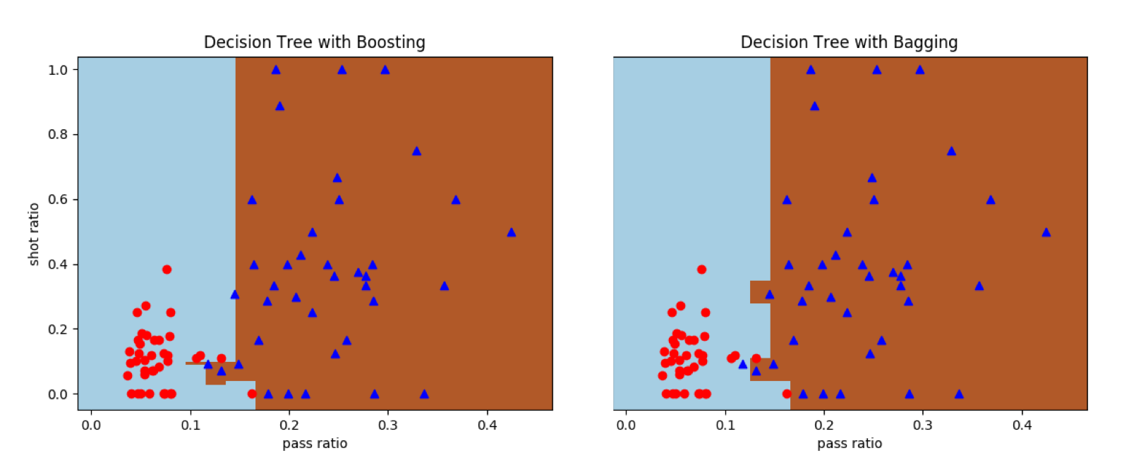 接下来,我将原始决策树算法和集成化的决策树算法应用在线性不可分的曼城-西布朗数据集上,观察其分类的结果。