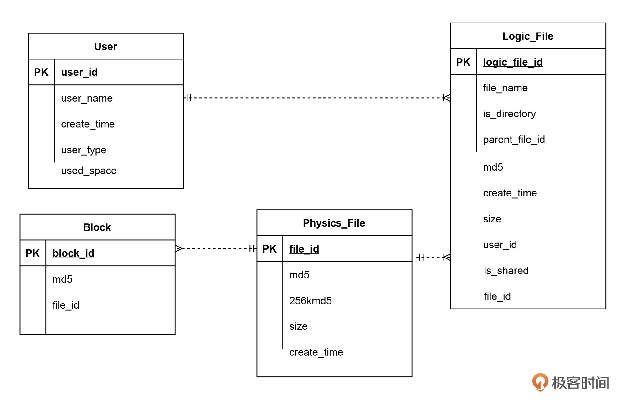 为此,我们需要将上面的元数据库表结构进行一些改动,将原来的File表拆分成物理文件表Physics_File和逻辑文件表Logic_File。其中,Logic_File记录用户文件的元数据,并和物理文件表Physics_File建立多对1关联关系,而Block表关联的则是Physics_File表,如下。