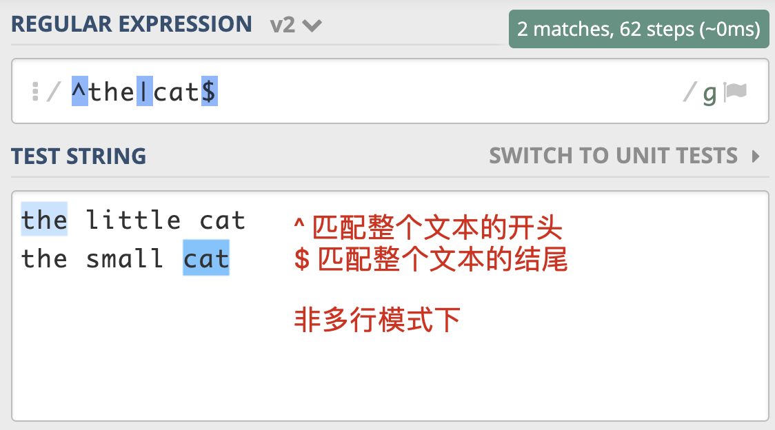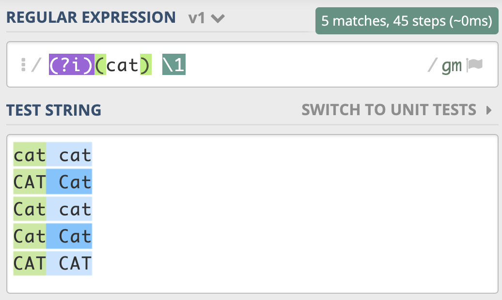 我们也可以用它来尝试匹配两个连续出现的 cat,如下图所示,你会发现,即便是第一个 cat 和第二个 cat 大小写不一致,也可以匹配上。