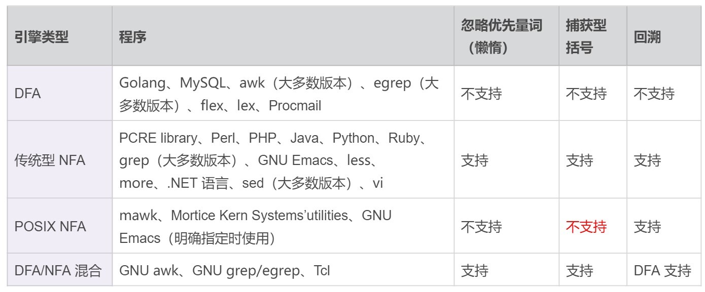 有穷自动机的具体实现称为正则引擎,主要有 DFA 和 NFA 两种,其中 NFA 又分为传统的NFA 和POSIX NFA。