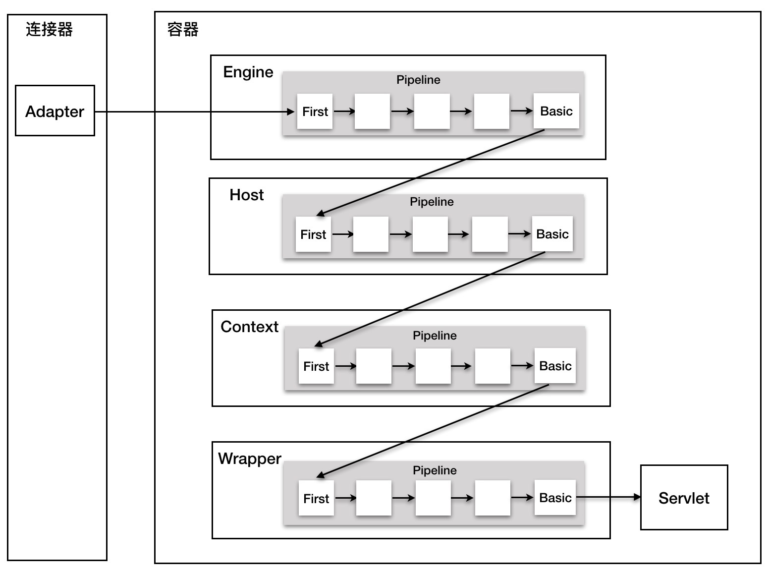每一个容器都有一个Pipeline对象,只要触发这个Pipeline的第一个Valve,这个容器里Pipeline中的Valve就都会被调用到。但是,不同容器的Pipeline是怎么链式触发的呢,比如Engine中Pipeline需要调用下层容器Host中的Pipeline。