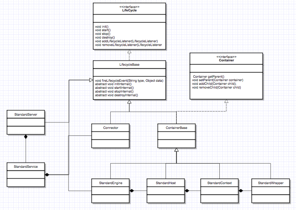StandardEngine、StandardHost、StandardContext和StandardWrapper是相应容器组件的具体实现类,因为它们都是容器,所以继承了ContainerBase抽象基类,而ContainerBase实现了Container接口,也继承了LifecycleBase类,它们的生命周期管理接口和功能接口是分开的,这也符合设计中接口分离的原则