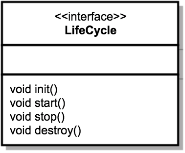 因此,我们把不变点抽象出来成为一个接口,这个接口跟生命周期有关,叫作Lifecycle。Lifecycle接口里应该定义这么几个方法:init、start、stop和destroy,每个具体的组件去实现这些方法。