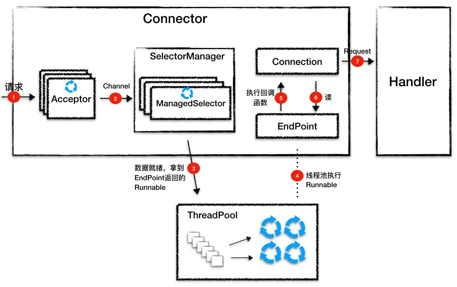 到此你应该了解了Connector的工作原理,下面我画张图再来回顾一下Connector的工作流程。
