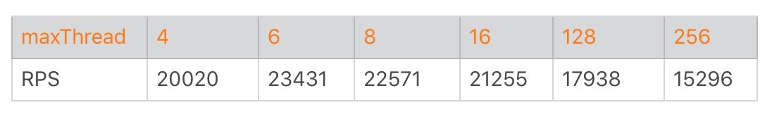 从上面的测试结果我们可以看到,20万个请求在9.99秒内处理完成,RPS达到了20020。 不知道你是否好奇,为什么我把最大线程数设置为4呢?是不是有点小?