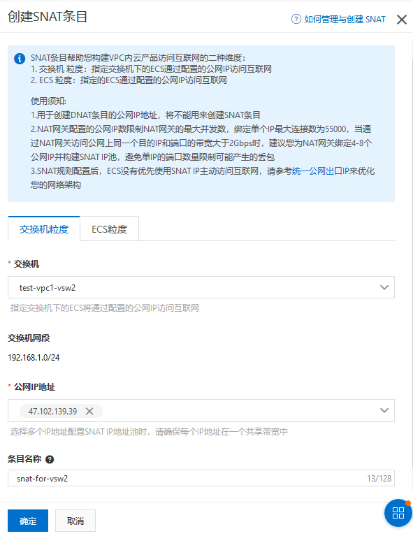 上面我们添加了一个SNAT条目,让整个交换机“test-vpc1-vsw2”下的网段都共享一个出口公网IP。你要注意,我们的虚拟机是位于这个网段内的