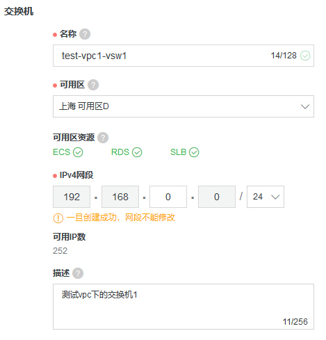 同时,我们还至少要创建一个子网,也就是交换机。我们选择一个子IP段192.168.0.0/24,并且设置所属可用区为“可用区D”: