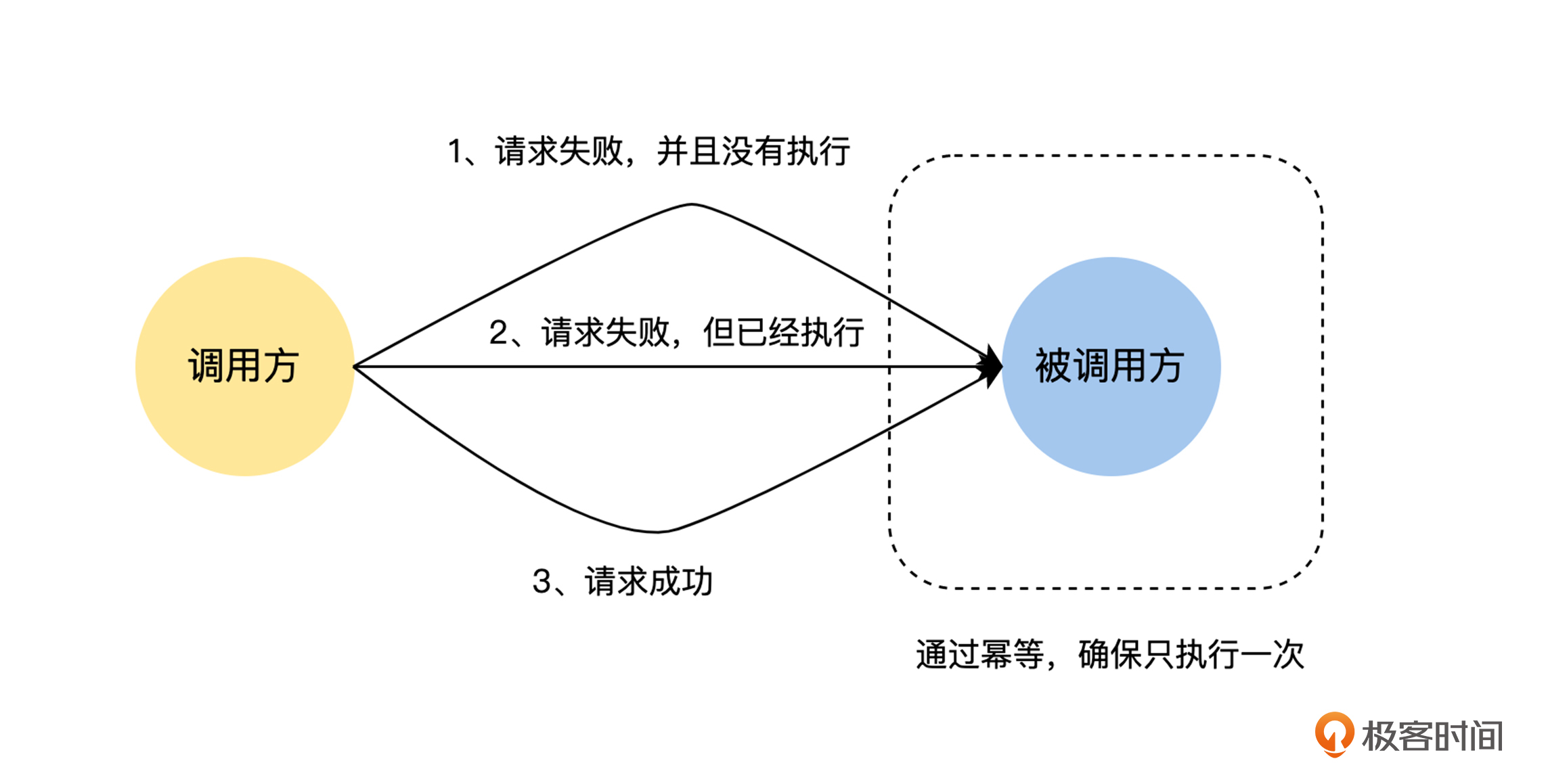 但是,我们同样要考虑到,重试会让用户对当前的课程重复购买,对于这个情况,我们可以在远端服务对课程购买接口的实现上,对请求进行去重,确保远端服务对同一个购买请求处理一次和多次的结果是完全相同的,对于这样的接口,我们称之为幂等的。