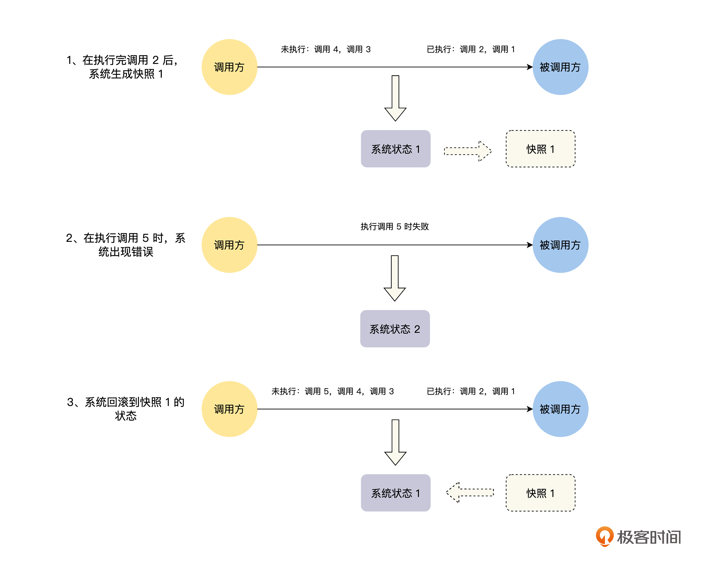 所以,分布式快照加状态回滚的方式,一般不会应用于在线业务架构中,它的主要应用场景是例如 Flink 之类的流式计算。因为在流式计算中,系统状态的存储也是系统设计的一部分,我们可以在系统设计的时候,就考虑支持快照和回滚功能。并且,在流式计算中,消息来源一般都是 Kafka 之类的消息系统,这样对消息进行重放就非常方便了。