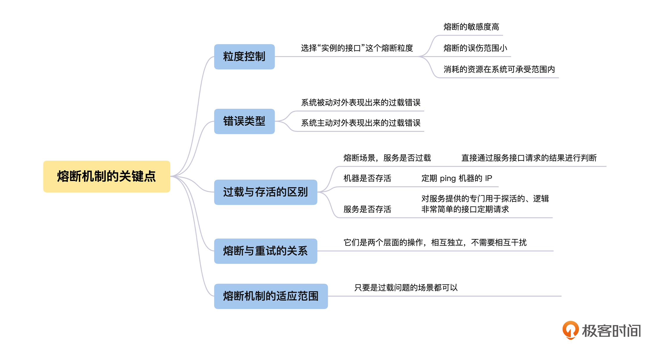 到这里,我们已经明白了什么是熔断机制,以及如何利用熔断机制来避免雪崩,但是在熔断机制的具体实现上,还会面临熔断的粒度选择和过载判断等关键的问题,所以接下来我们一起从“粒度控制”、“错误类型”、“存活与过载的区别”、“重试和熔断的关系”和“熔断机制的适应范围”这五个角度来讨论熔断机制的关键点。