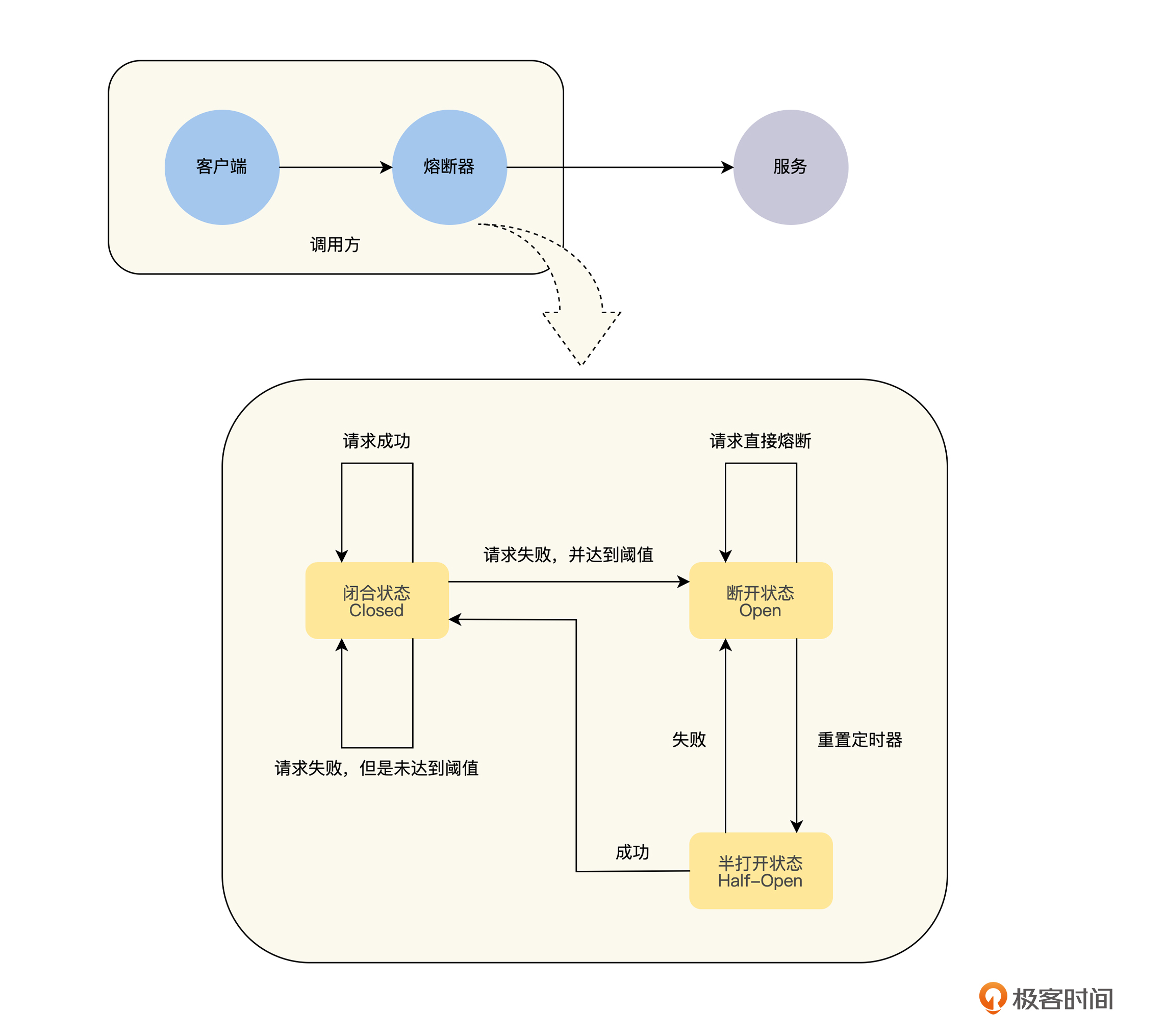 最后,是半打开状态( Half-Open )。在该状态下,允许应用程序将一定数量的请求发往被调用服务,如果这些调用正常,那么就可以认为被调用服务已经恢复正常,此时熔断器切换到闭合状态,同时需要重置计数。如果这部分仍有调用失败的情况,我们就认为被调用方仍然没有恢复,熔断器会切换到断开状态,然后重置计数器。所以半打开状态能够有效防止正在恢复中的服务,被突然出现的大量请求再次打垮的情况。