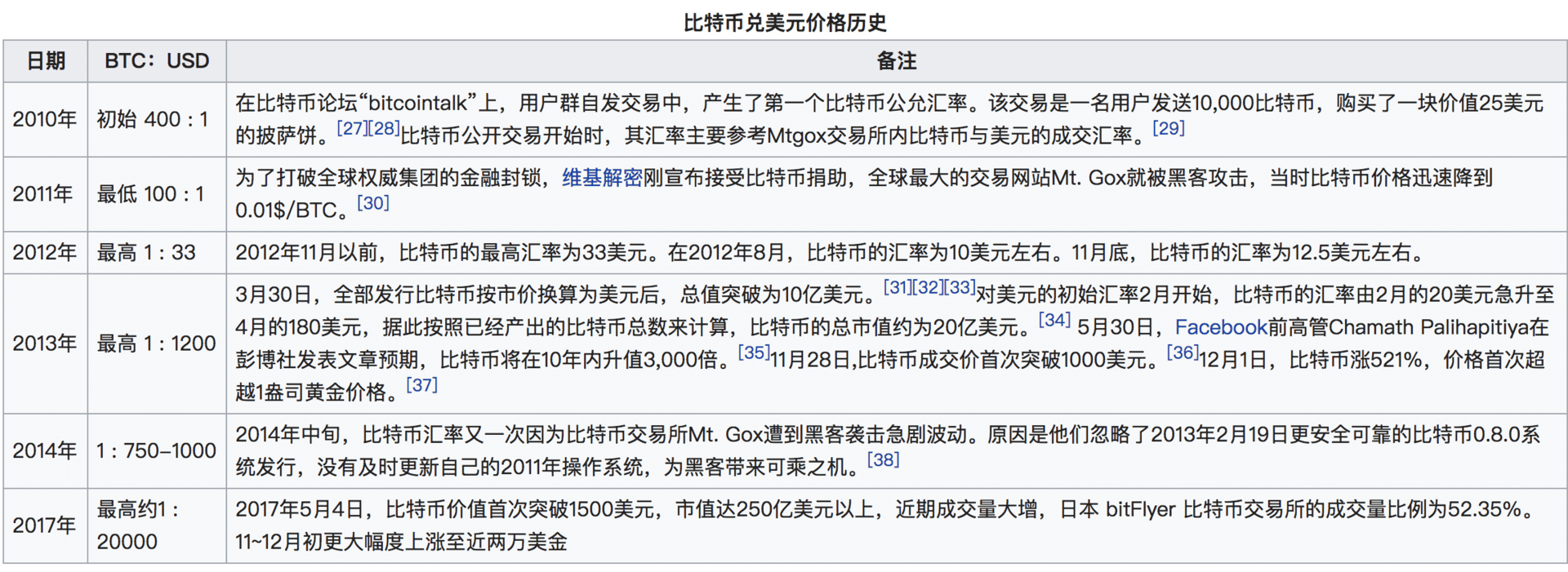 最后附一份由维基百科归纳的比特币价格变化以及对应的事件。