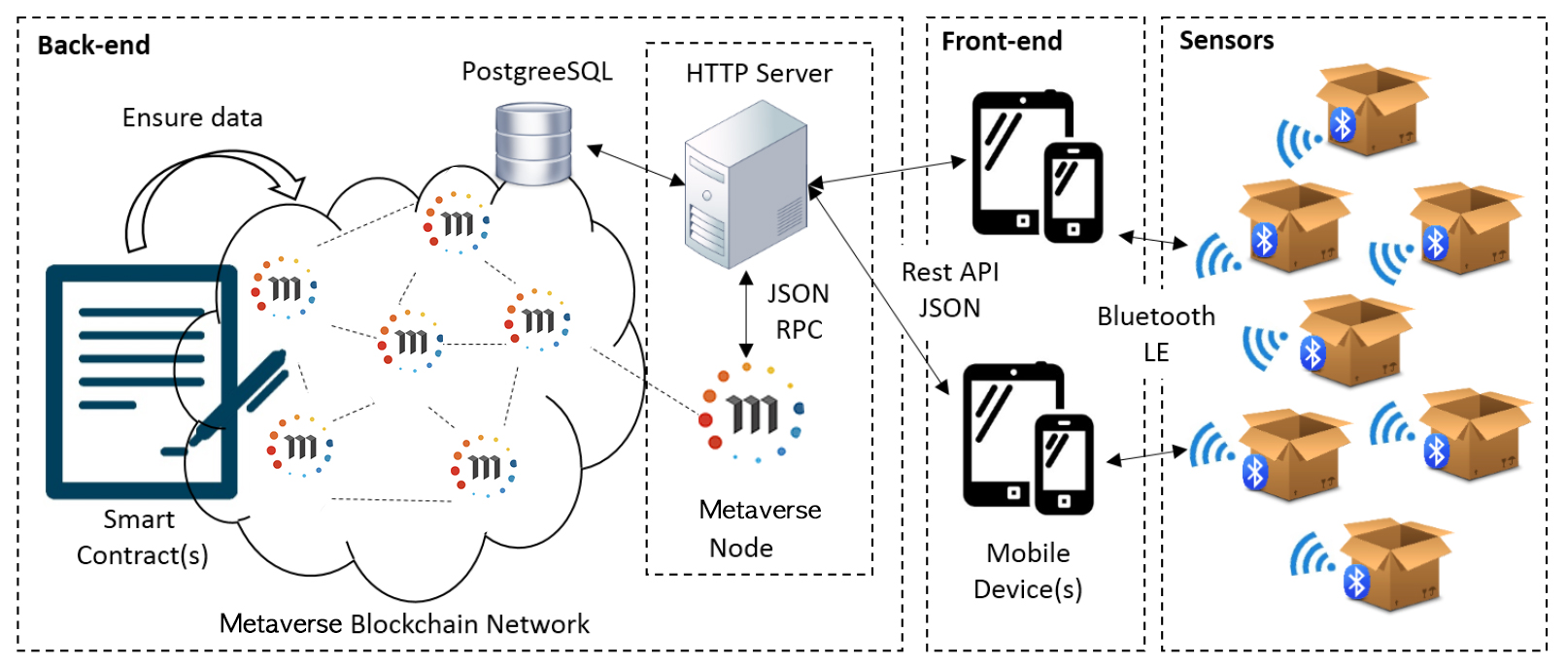 在Front-end部分,工作人员可以通过移动设备获得订单数据,工作人员也可以像以前一样,通过IoT蓝牙传感器获得货物的数据,接着通过移动设备上传至服务器,由服务器挑选并计算后登记到元界区块链上。