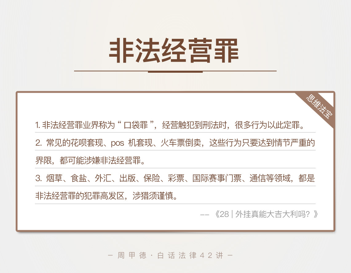 还有一些比较常见的非法经营行为,比如“烟草”“食盐”“外汇”“出版”“保险”“彩票”“国际赛事门票”“通信”等,这些领域也都是犯罪高发区,涉猎须谨慎。