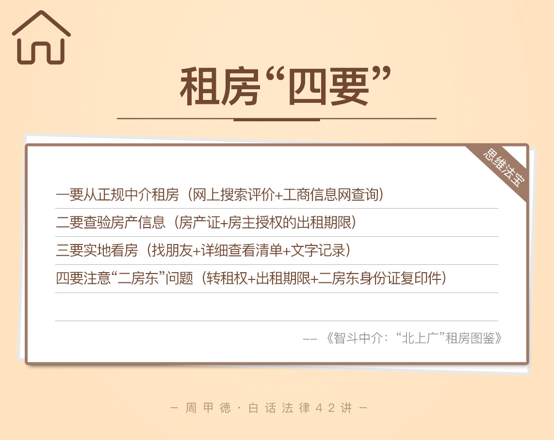 亡羊补牢不算晚,但事后补救总是难免受损,不如先把隐患的苗头给掐了。根据这么多年接手的案例分析和自身的租房经历,我总结了“租房四要”给你做参考。