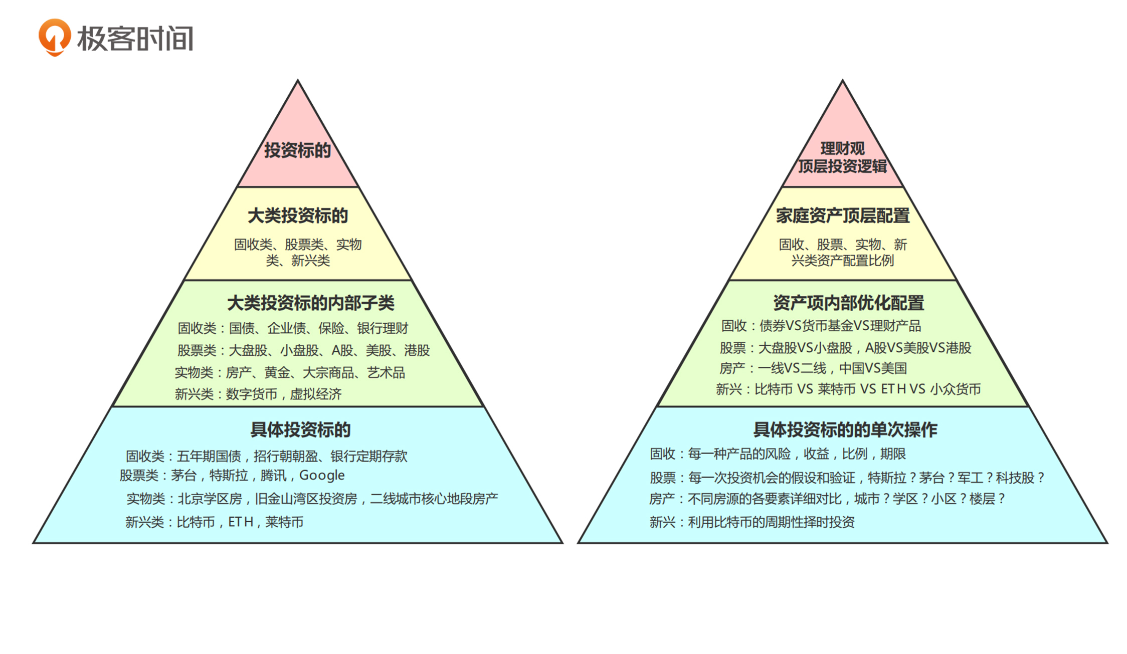 这四大类投资标的还可以具体往下细分:每一类投资标的都有内部子类,每一个子类中又有很多具体的投资标的。这样,就可以组成一个从大类到小类,由高层级到低层级排列的投资标的金字塔。具体你可以看下图1的左半部分。