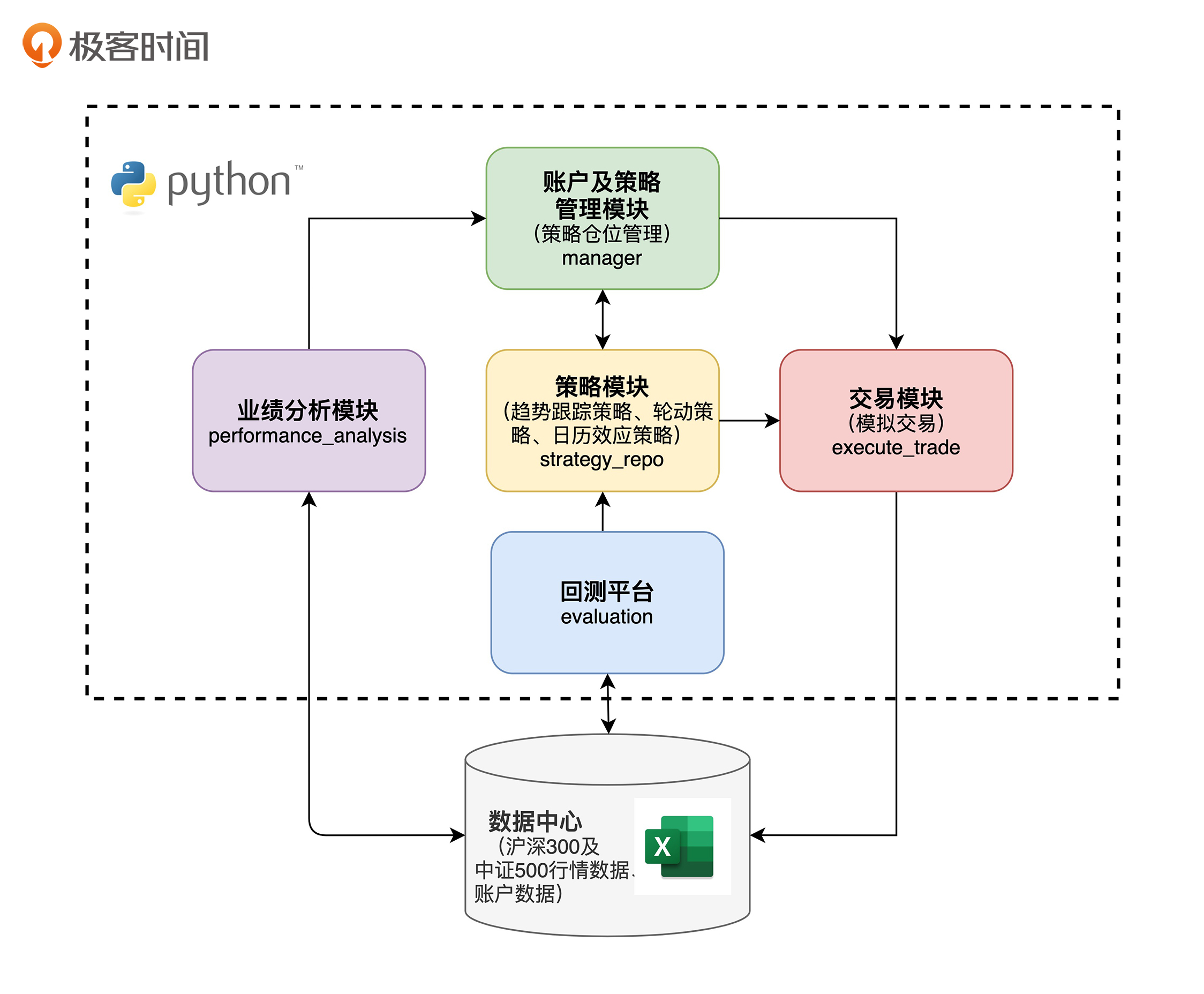 认真学习了前面课程的同学看到这里,应该会会心一笑:这一讲又到了发挥我们程序员技术优势的时候了。我们会在 19讲 介绍的量化投资框架基础上,搭建出一个包含了管理模块、策略模块、回测平台、数据中心、业绩分析模块和模拟交易模块在内的一整套量化投资系统。