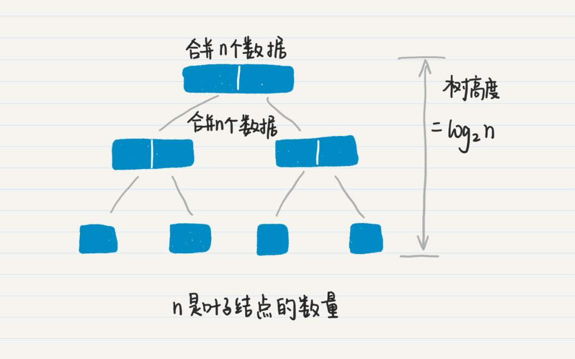 两个阶段加起来的时间复杂度为O(n-1)+nlog2n,最终简化为nlogn。是不是很直观?