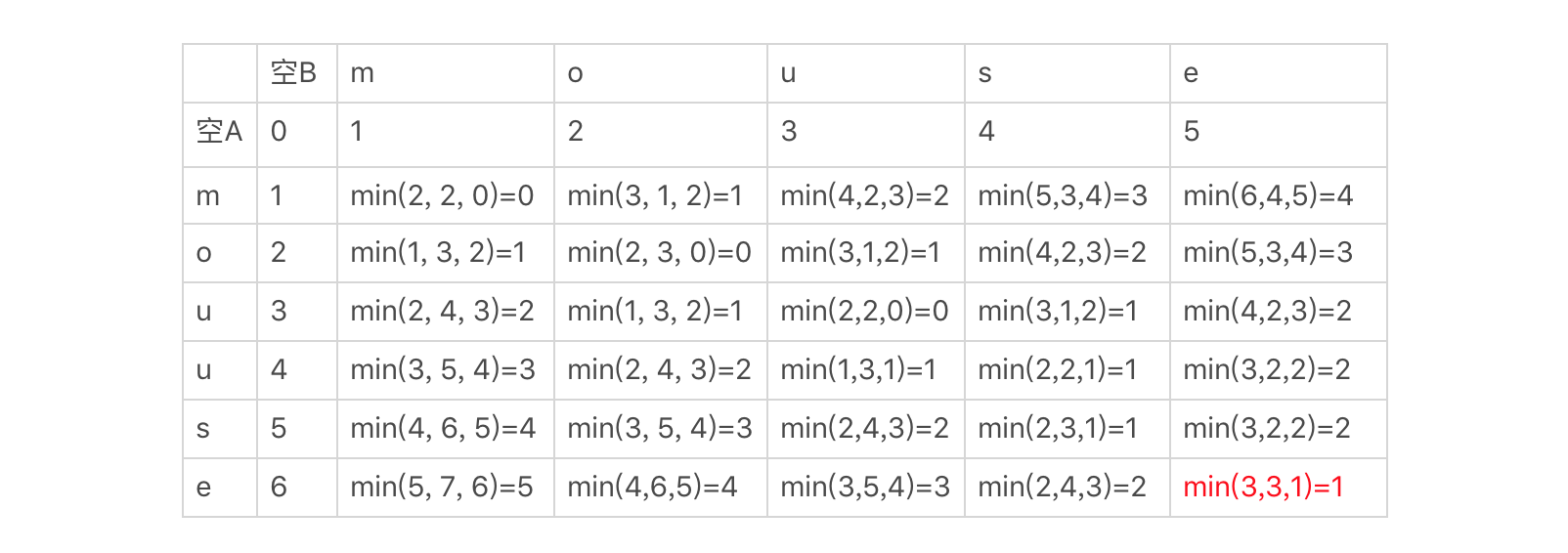 例如,在使用动态规划法的时候,我们经常要画出状态转移的表格。看到这类表格,我们可以很容易地得出该算法的时间复杂度和空间复杂度。以编辑距离为例,参看下面这个示例的图表,我们可以发现每个单元格都对应了3次计算,以及一个存储单元,而总共的单元格数量为m*n,m为第一个字符串的长度,n为第二个字符串的长度。所以,我们很快就能得出这种算法的时间复杂度为O(3m*n),简写为O(m*n),空间复杂度为O(m*n)。