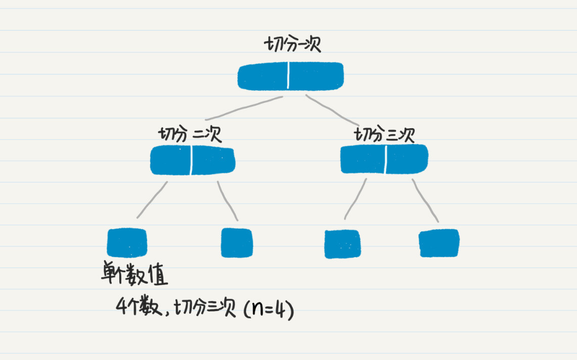 假设等待排序的数组长为n。首先,看数据切分阶段。数据切分的次数,就是切分阶段那棵树的非叶子结点的数量。这个切分阶段的树是一棵满二叉树,叶子结点是n个,那么非叶子结点的数量就是n-1个,所以切分的次数也就是n-1次。如果我们切分数据的时候,并不重新生成新的数据,而只是生成切分边界的下标,那么时间复杂度就是O(n-1)。