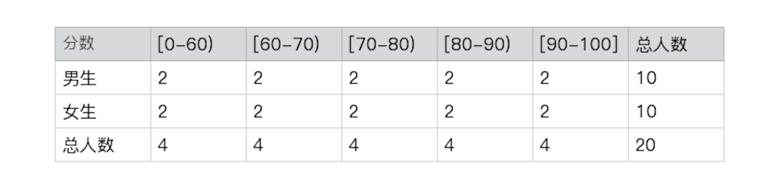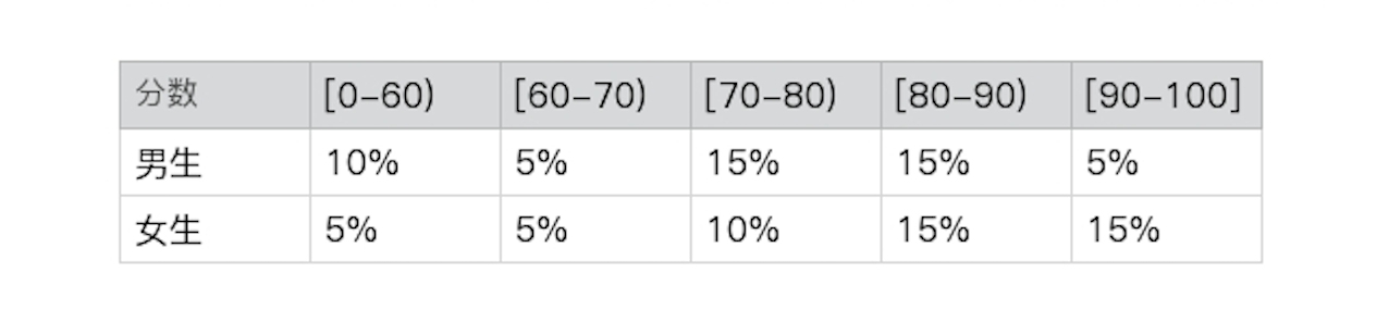 仔细看,这个问题和前面几个有所不同,我只关心男生这个群体,所以解答应该是找到考了90分以上的男生的人数,然后用这个人数除以男生总人数(注意,不再是全部总人数)。根据上述表格的数据来计算,P(90-100|男生)= 2⁄10=20%。