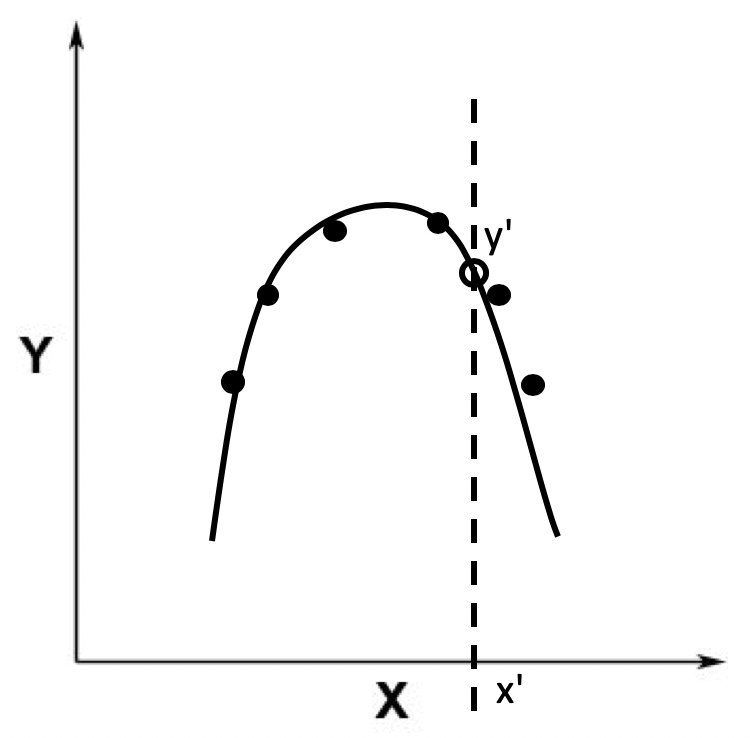有了这条曲线,我们就能根据测试数据的x轴取值(如图中的x’)来获取y轴的取值(如图中的y’),也就是根据自变量的值来获取因变量的值,达到预测的效果。这种情况就是适度拟合(right fitting)。
