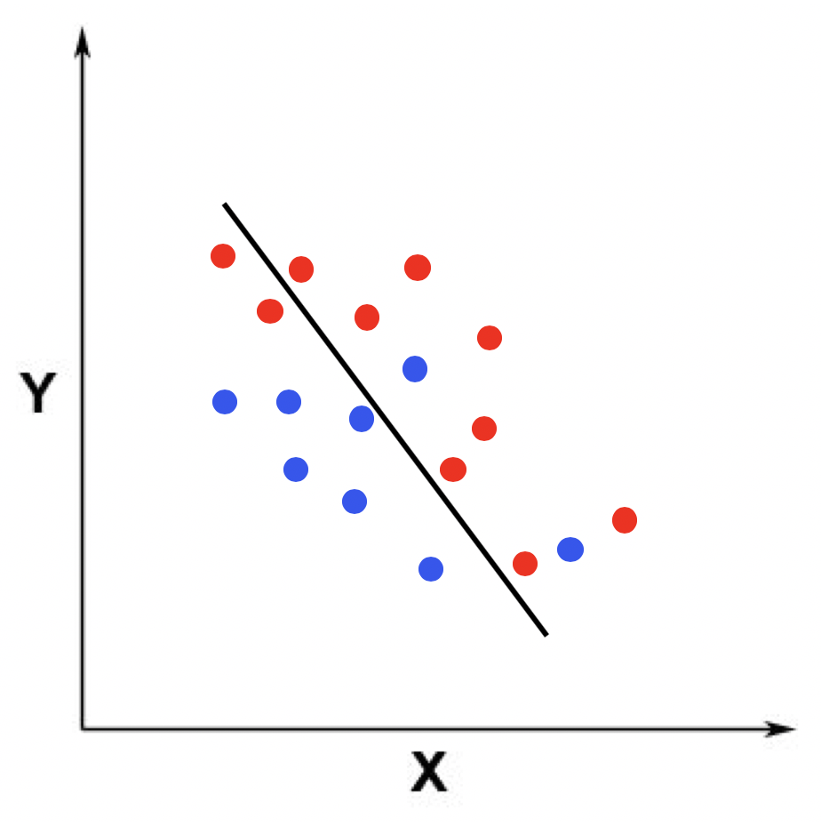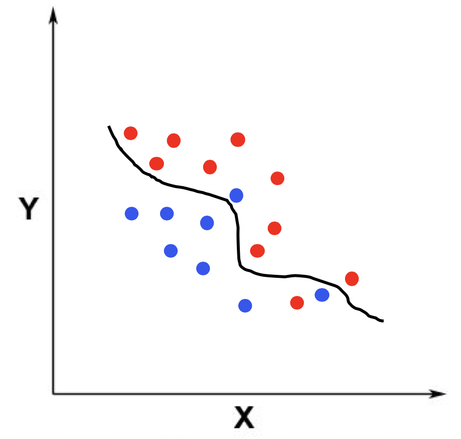 这张图中,蓝色的点表示分类1的训练数据点,红色的点表示分类2的训练数据点。在适度拟合的时候,分界线比较好地区分了蓝色和红色的点。