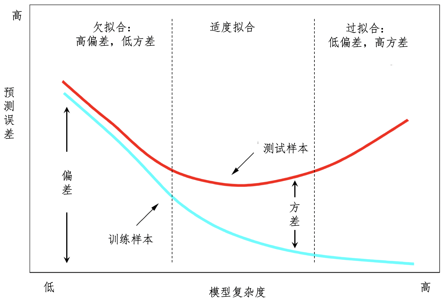 在这个图中,x轴表示模型的复杂程度,y轴表示预测的误差。蓝色曲线表示模型在训练样本上的表现,它和x轴之间的距离表示了偏差。而红色曲线表示模型在测试样本上的表现,它和蓝色曲线之间的距离表示了方差。