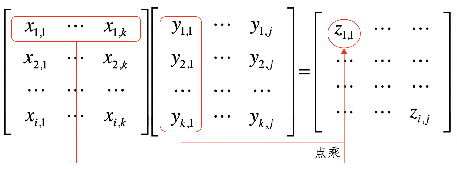其中,矩阵\(Z\)为矩阵\(X\)和\(Y\)的乘积,\(X\)是形状为i x k的矩阵,而\(Y\)是形状为k × j的矩阵。\(X\)的列数k必须和\(Y\)的行数k相等,两者才可以进行这样的乘法。