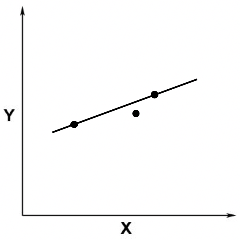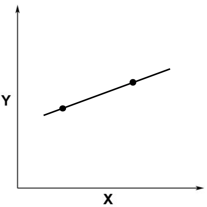 假设我们有两个观测数据,对应于二维空间中的两个点,这两个点可以确定唯一的一条直线,两者呈现线性关系。你可以参考下面这张图。