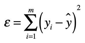 其中,\(y\_i\)表示来自数据样本的观测值,而\(y\)^是假设的函数的理论值,\(ε\)就是我们之前提到的误差,在机器学习中也常被称为损失函数,它是观测值和真实值之差的平方和。最小二乘法里的“二乘”就是指的平方操作。有了这个公式,我们的目标就很清楚了,就是要发现使ε最小化时候的参数。
