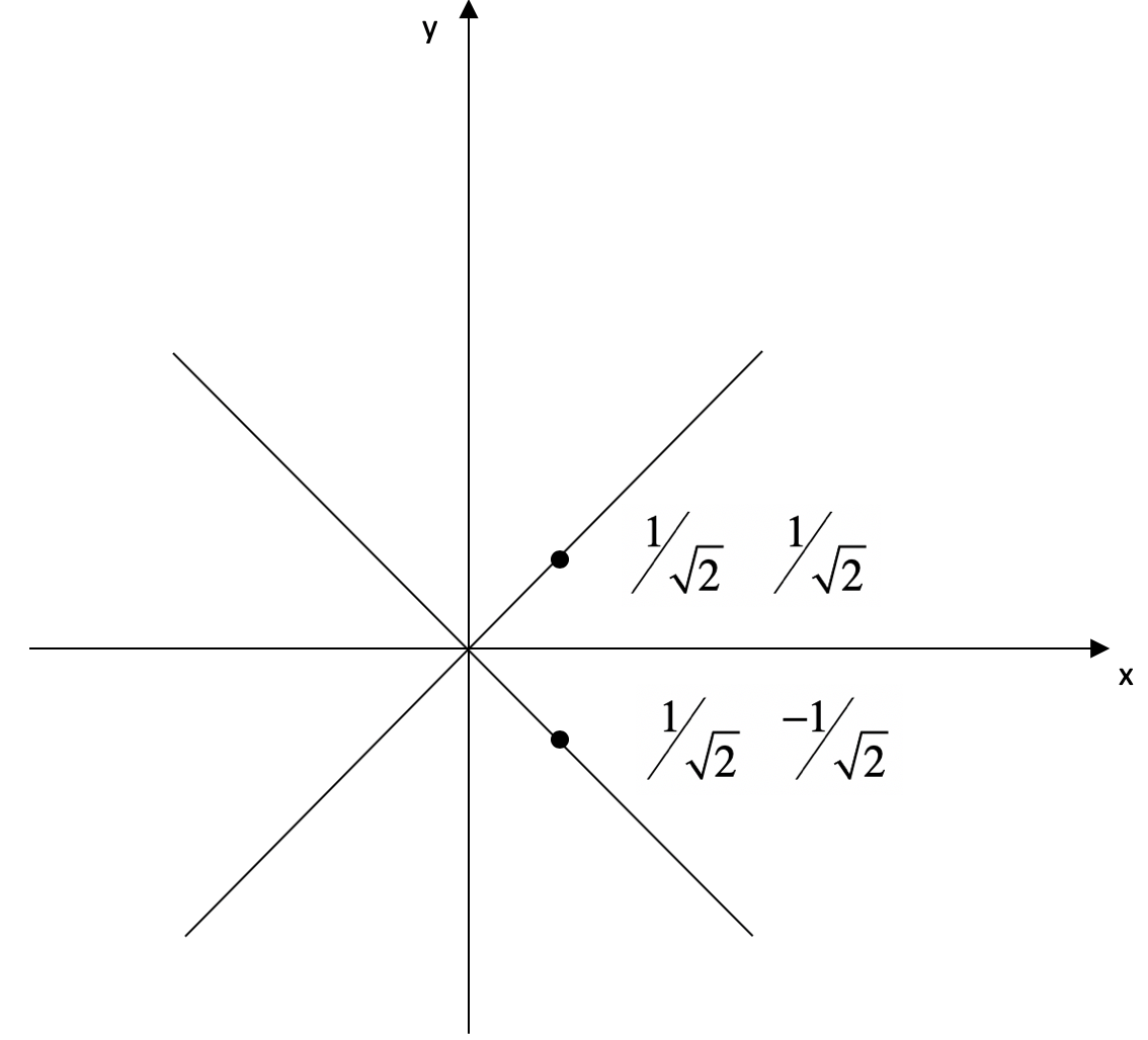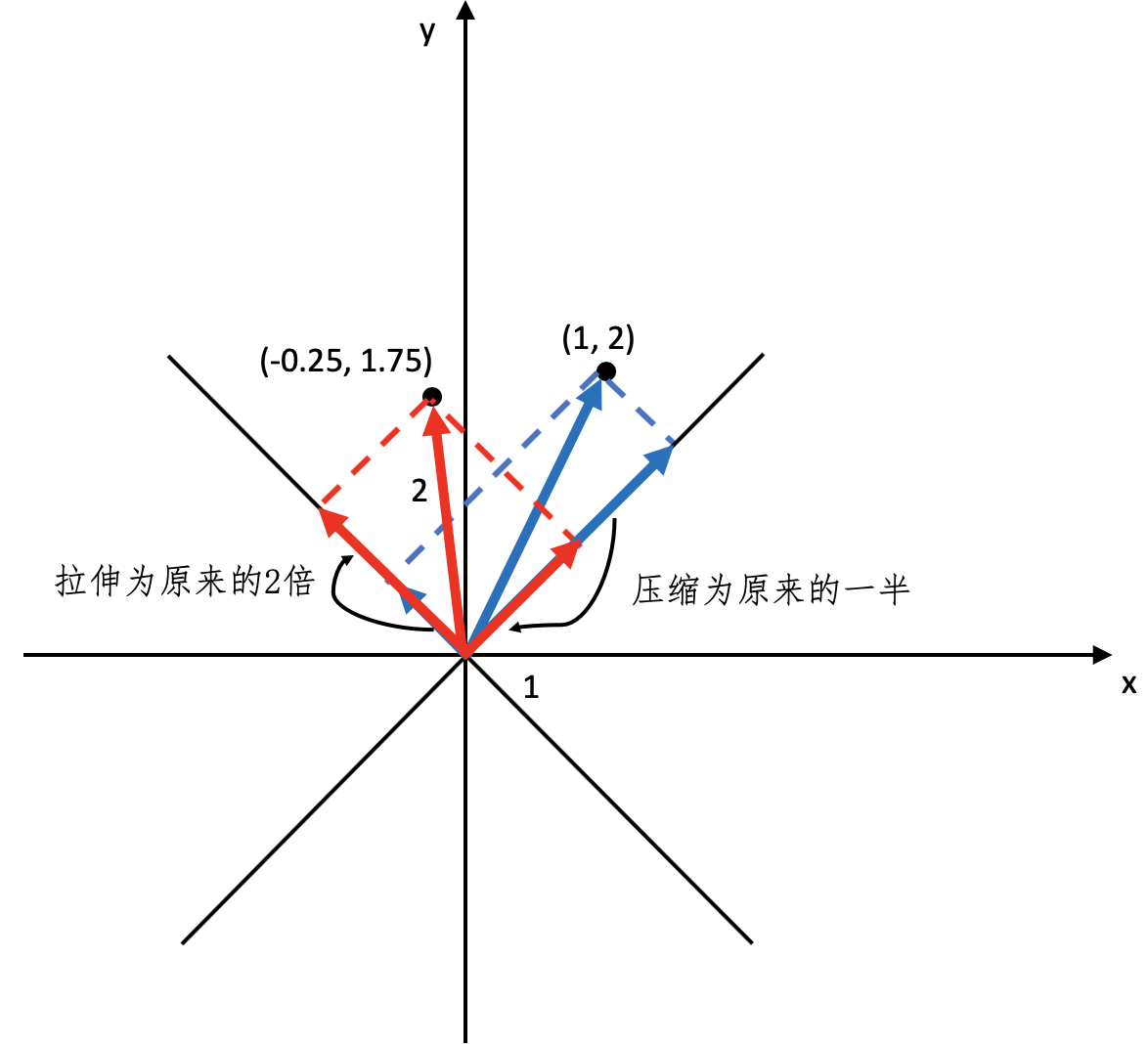 把这个新的坐标\((-0.25, 1.75)\)和原坐标\((1,2)\)都放到二维坐标系中,并让它们分别在\(\[\\frac{1}{\\sqrt{2}} \\frac{1}{\\sqrt{2}}\]\)和\(\[\\frac{1}{\\sqrt{2}} \\frac{-1}{\\sqrt{2}}\]\)这两个方向进行投影,然后比较一下投影的长度,你就会发现伸缩的变化了。我使用下面这张图来帮你理解。