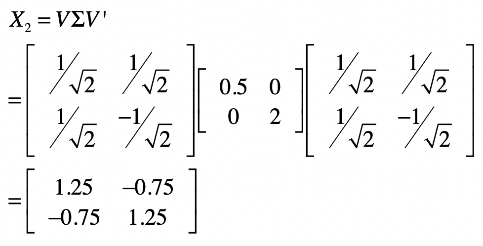 之所以使用这样一个例子,是因为\(V\)是一个酉矩阵,也就是说\(VV’=I\),所以我们可以使用它,外加一个特征值组成的对角矩阵\(Σ\),来构建另一个用于测试的矩阵\(X\_2\)。我在SVD的那一讲,介绍过对称方阵可以进行特征值分解,所以我们可以通过\(V\)和\(Σ\),获得一个对称方阵\(X\_2=VΣV’\)。