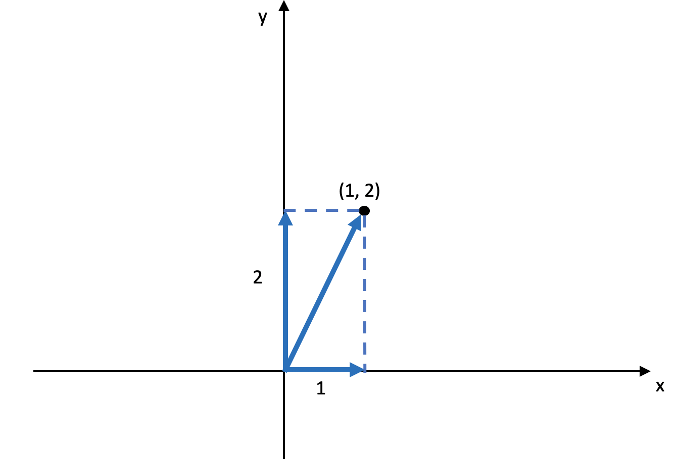 理解了正交向量之后,我们来定义一个二维空间,这个空间的横坐标为\(x\),纵坐标为\(y\),空间中的一个点坐标为\((1,2)\),对于这个点,我们可以把从原点到它的直线投影到\(x\)轴和\(y\)轴,这个直线在\(x\)轴上投影的长度为1,在y轴上投影的长度为2。我使用下图来表示。