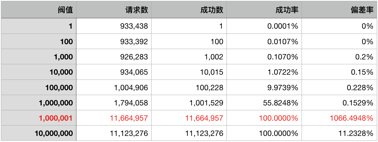 上图中有个红色字体部分,当阀值设置为 100 万而请求数超过 100 万时,发生了很大偏差。这是一个很奇怪的测试结果,但如果心里对各种基准效率数据有谱的话,会知道这实际绝不会影响线上服务的运行。