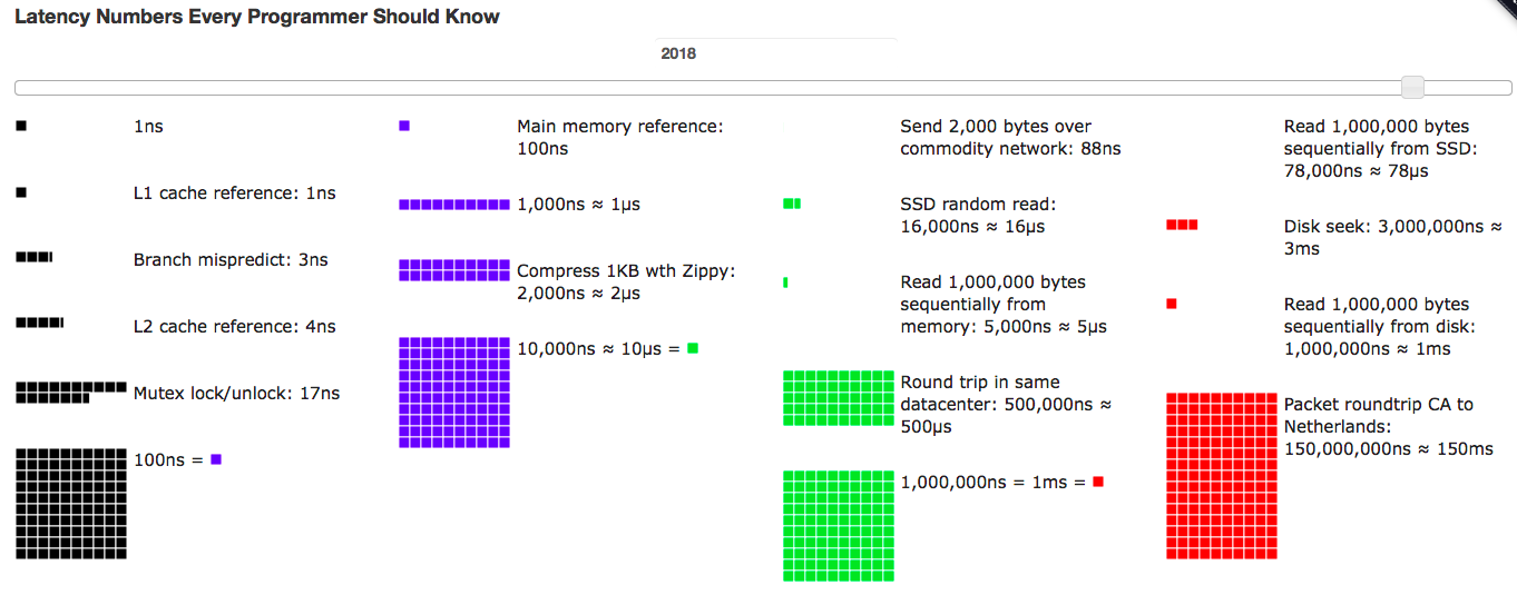 写程序我们追求 “又快又好”,并且写出来的代码要符合 “信、达、雅” 的标准,但清晰定义 “多快多好” 则是指运行时的效率和效果。为准确评估代码的运行效率和效果,每个程序员可能都需要深刻记住并理解下面这张关于程序延迟数字的图: