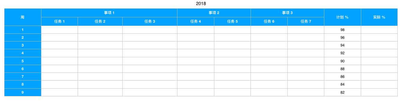 今天 SMART 已经非常流行和常见,我就不解释其具体含义了,而是讲讲我如何通过 SMART 来跟踪个人年度计划执行的。按 SMART 方式定义的计划执行起来都是可以量化跟踪的,我通常用如下格式的一张表来跟踪:
