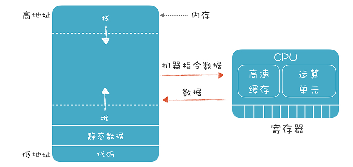 1.了解程序运行的环境,包括CPU、内存和操作系统,探知它们跟程序到底有什么关系。- 2.了解程序运行的过程。比如,一个程序是怎么跑起来的,代码是怎样执行和跳转的,又是如何管理内存的。