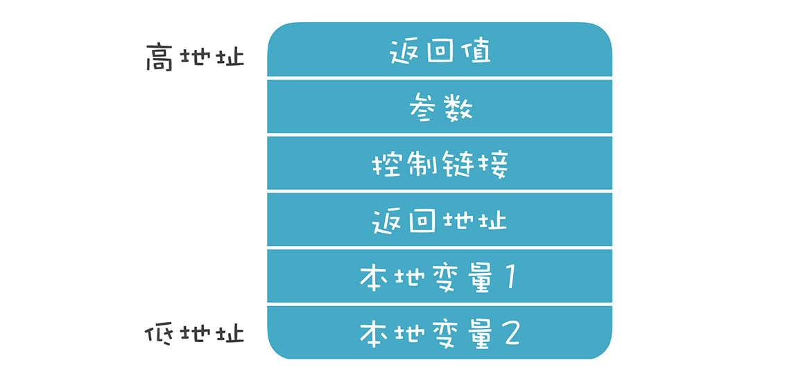 返回值:一般放在最顶上,这样它的地址是固定的。foo()函数返回以后,它的调用者可以到这里来取到返回值。在实际情况中,我们会优先通过寄存器来传递返回值,比通过内存传递性能更高。